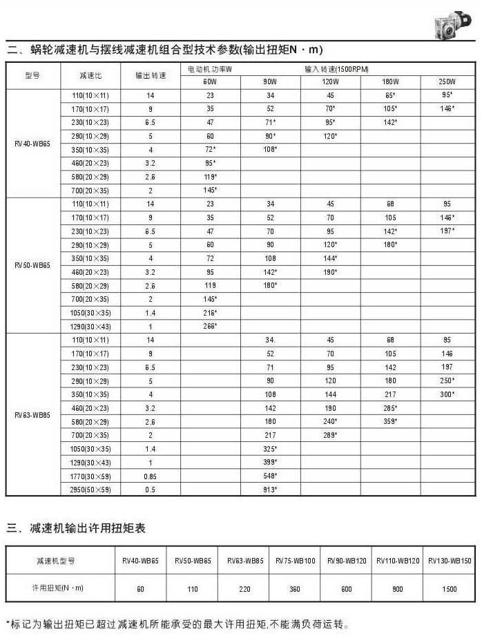 蝸輪減速機與WB系列擺線減速機組合型技術(shù)參數(shù)表(輸出扭矩N.M)一減速機輸出許用扭矩表